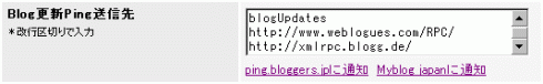 (2)「Blogの設定/管理」の下の方を見てもらうと、「Blog更新Ping送信先」の入力欄があります(↓下記画像)
