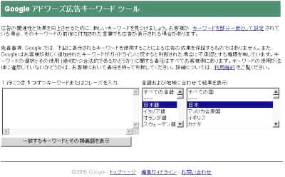 Googleが提供しているキーワード選定ツール。アクセスアップ対策を考える場合、キーワードが重要なカギになります。このGoogleのキーワードツールは、自分のホームページ、Blog(ブログ)の記事を作成する時に、キーワードを探す時に役立つツールです。